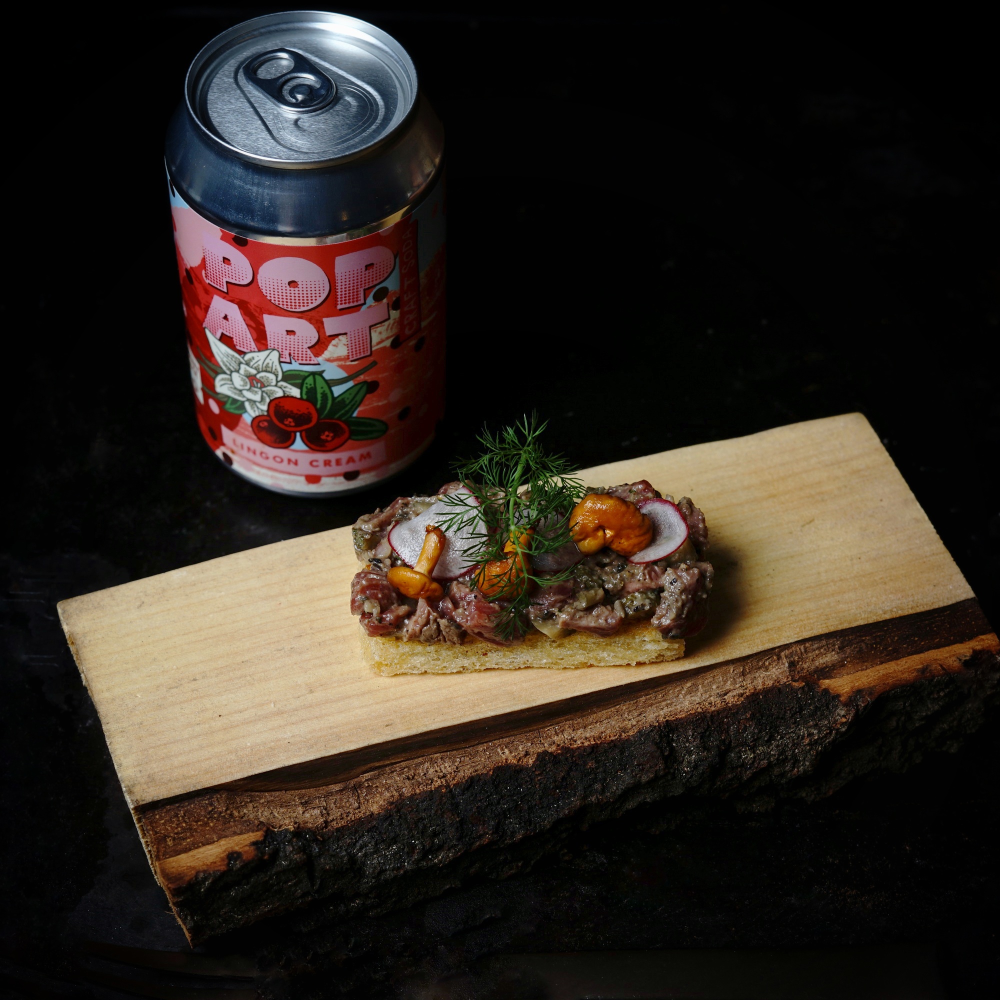 Steak tartare with mushroom ketchup, pickled hon shmeji mushroom, dill, radish. Servered on a milk butter toast.