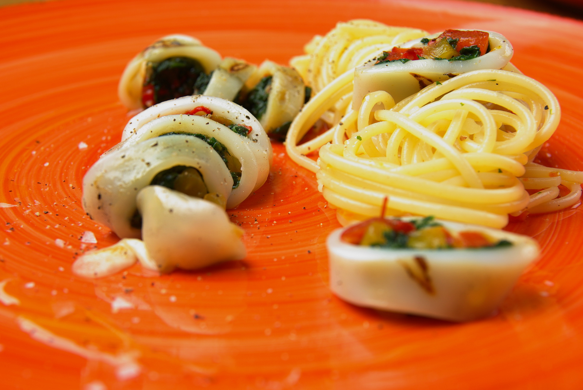 När du sedan kan ta i bläckfiskkropparna ska du fylla dem med en bit ost och lite paprika och bladspenatsröra och varva på så…tills dess att kroppen nästan är fylld, kläm ihop ”kroppen” och lås med en rejäl sticka (tandpetare funkar dåligt om de är stora bläckfiskar du fått tag på) Stek dem sedan hastigt i en het grillpanna som ger sjyssta ränder…tag upp och lägg dem i en ugnsfast form och baka sedan av bläckfisken i ugnen på 175° i 15 minuter…koka pasta och skär sedan snygga bitar av den fyllda bläckfisken och montera lite snyggt på tallriken. Servera gärna med vitt vin och ett gott bröd, ringla även över lite god olivolja och dra något drag med pepparkvarnen över alltsammans. Glöm inte att dra ut tandpetarna innan ni käkar/serverar! Både farligt & oproffsigt att låta de sitta kvar!